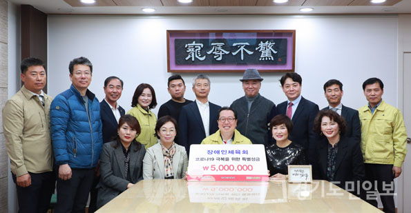 남양주시장애인체육회가 경기사회복지공동모금회에 코로나19 극복 기원 성금 500만원을 후원하고 있다.