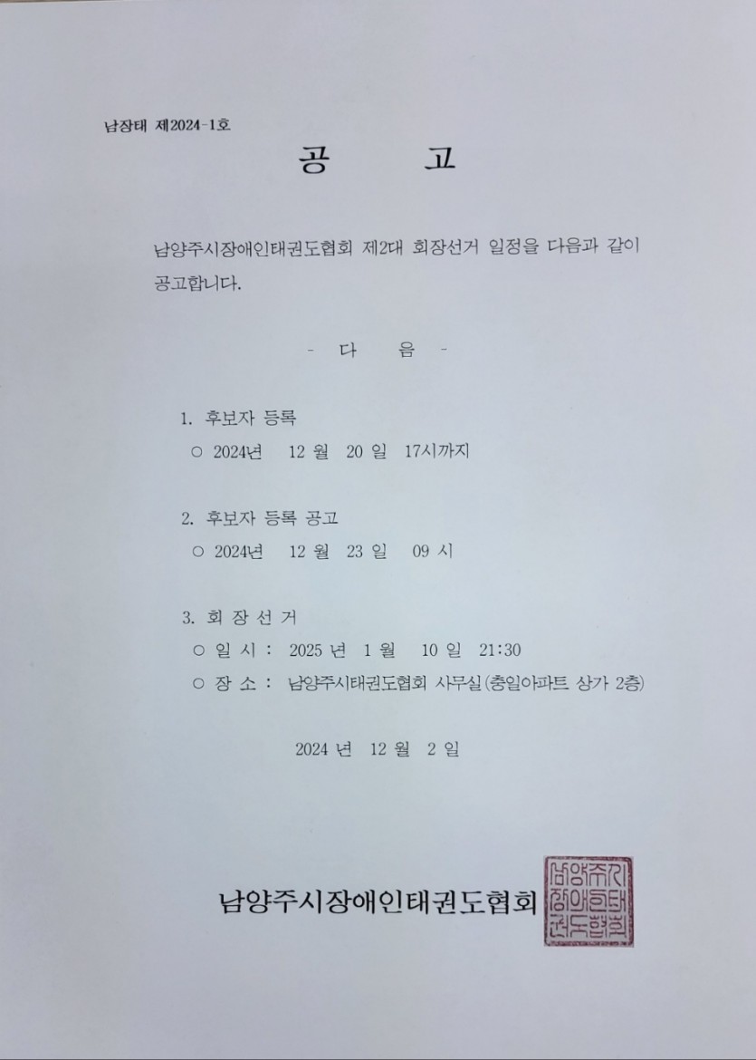 - 게시방법 : 남양주시장애인체육회 홈페이지 및 태권도협회 사무국