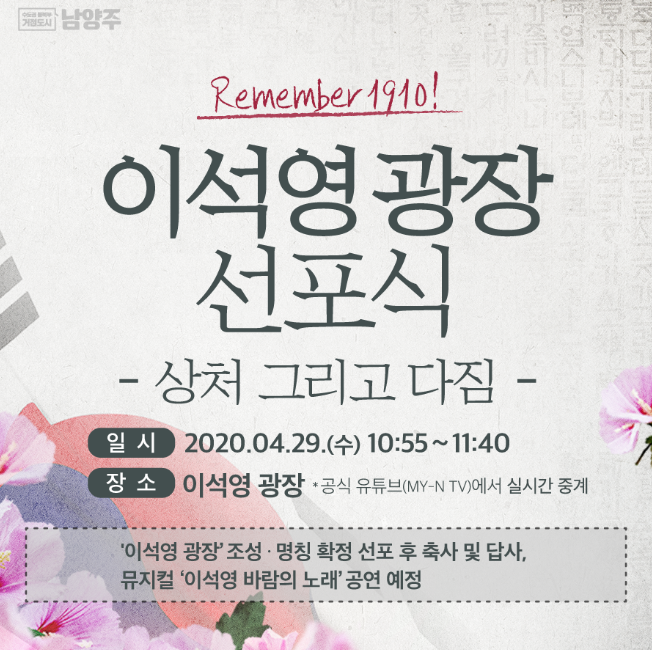 오는 29일 수요일(내일), 이석영 광장 선포식을 시작으로 역사공원으로의 의미있는 걸음을 내딛습니다. 금곡사거리, 홍유릉 앞을 가로막고 있던 건물을 철거하고 새롭게 조성된 광장으로서 의미가 깊은 날이기에 많은 행사들 또한 준비되어 있다고 합니다.