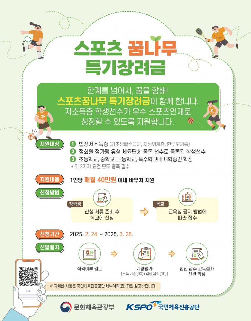 - 붙임1. 2025년도 스포츠꿈나무 특기장려금사업 세부계획안★_공지.hwp (325.0K) 9회 다운로드 | DATE : 2025-03-21 09:48:37